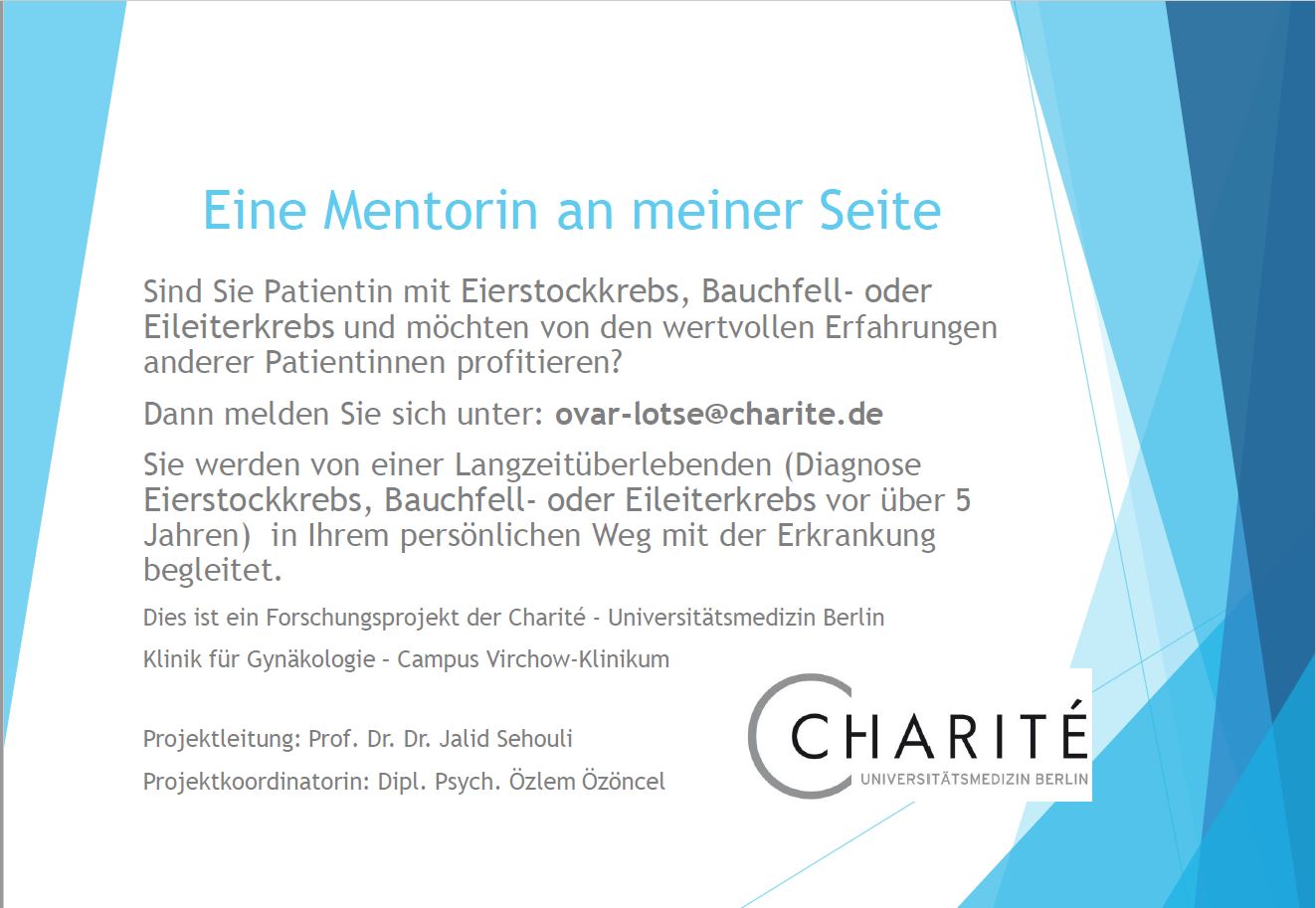 Falls Sie Interesse haben an einer Teilnahme an dem Ovar-Lotsen Projekt, als Mentorin oder Mentee, melden Sie sich bitte bei Dipl. Psychologin Özlem Özöncel unter: ovar-lotse@charite.de