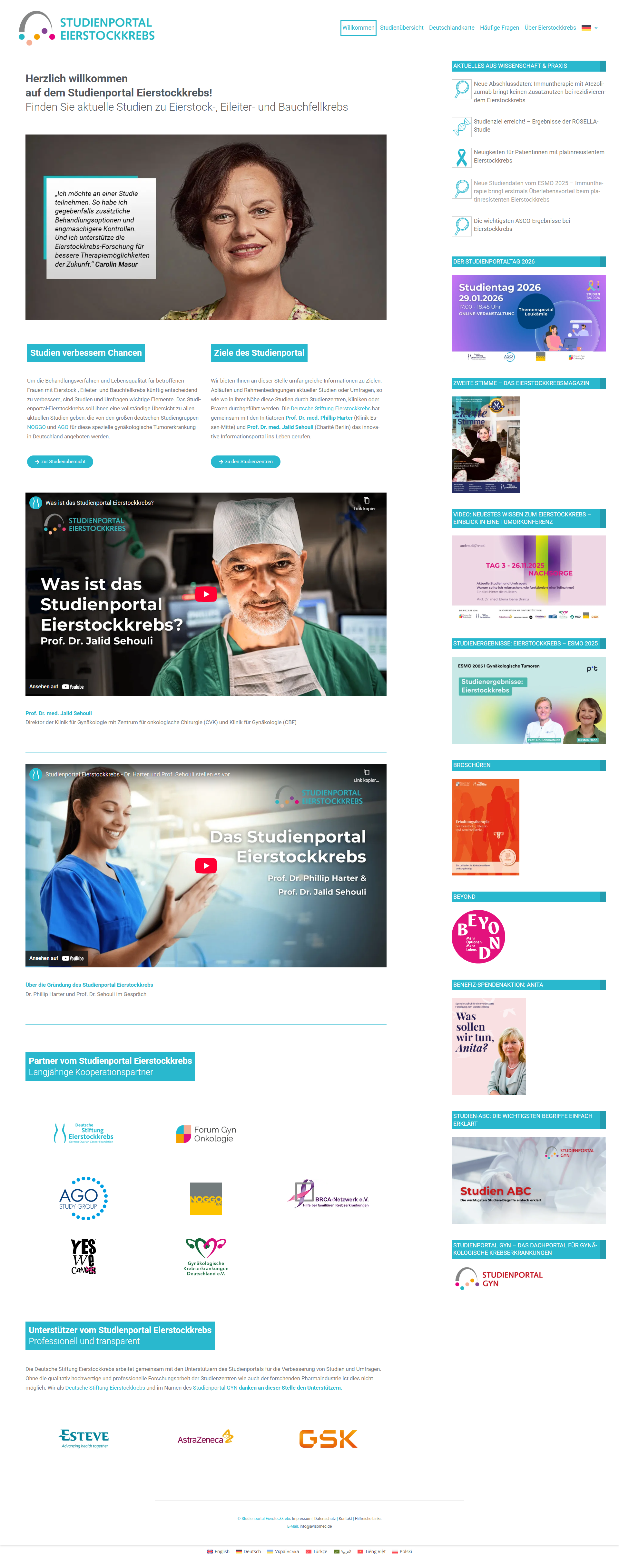 Wir bieten Ihnen an dieser Stelle umfangreiche Informationen zu Zielen, Abläufen und Rahmenbedingungen aktueller, offener Studien oder Umfragen, sowie wo in Ihrer Nähe diese Studien durch Studienzentren, Kliniken oder Praxen durchgeführt werden. Die Deutsche Stiftung Eierstockkrebs hat gemeinsam mit den Initiatoren Dr. med. Phillip Harter, Klinik Essen-Mitte, und Prof. Dr. med. Jalid Sehouli, Charité Berlin, das umfangreiche Informationsportal ins Leben gerufen.