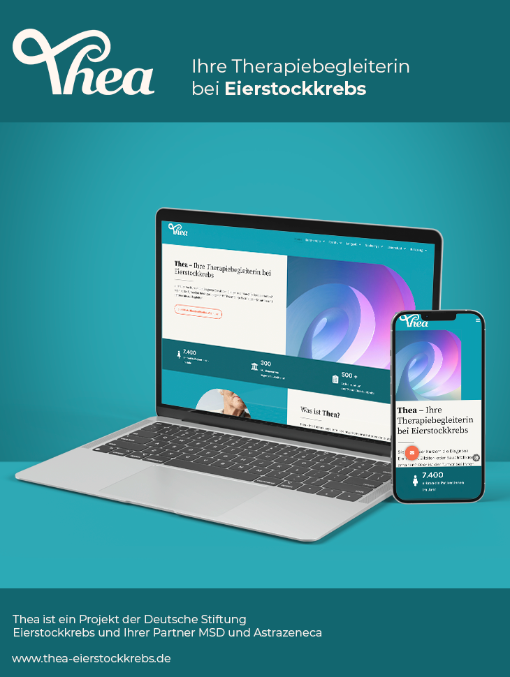 Mit Thea hat die Deutsche Stiftung Eierstockkrebs eine Plattform geschaffen, die Frauen mit Eierstock-, Eileiter- oder Bauchfellkrebs umfassend begleitet. Ziel ist es, Patientinnen und ihre Angehörigen in allen Phasen der Erkrankung zu unterstützen – von der Diagnose und Ersttherapie über Rezidive und Nachsorge bis hin zu Langzeitüberleben und Lebensfreude.