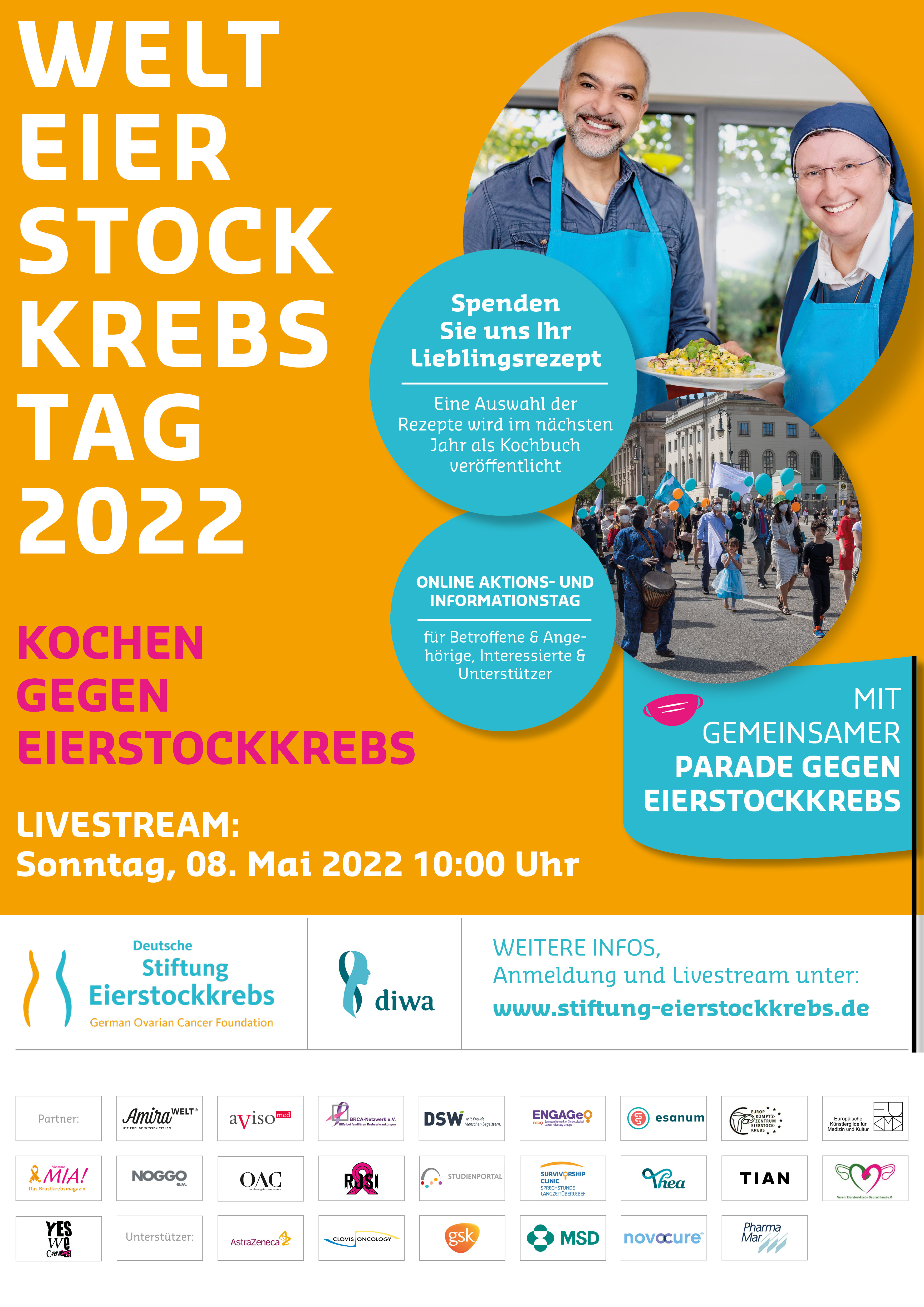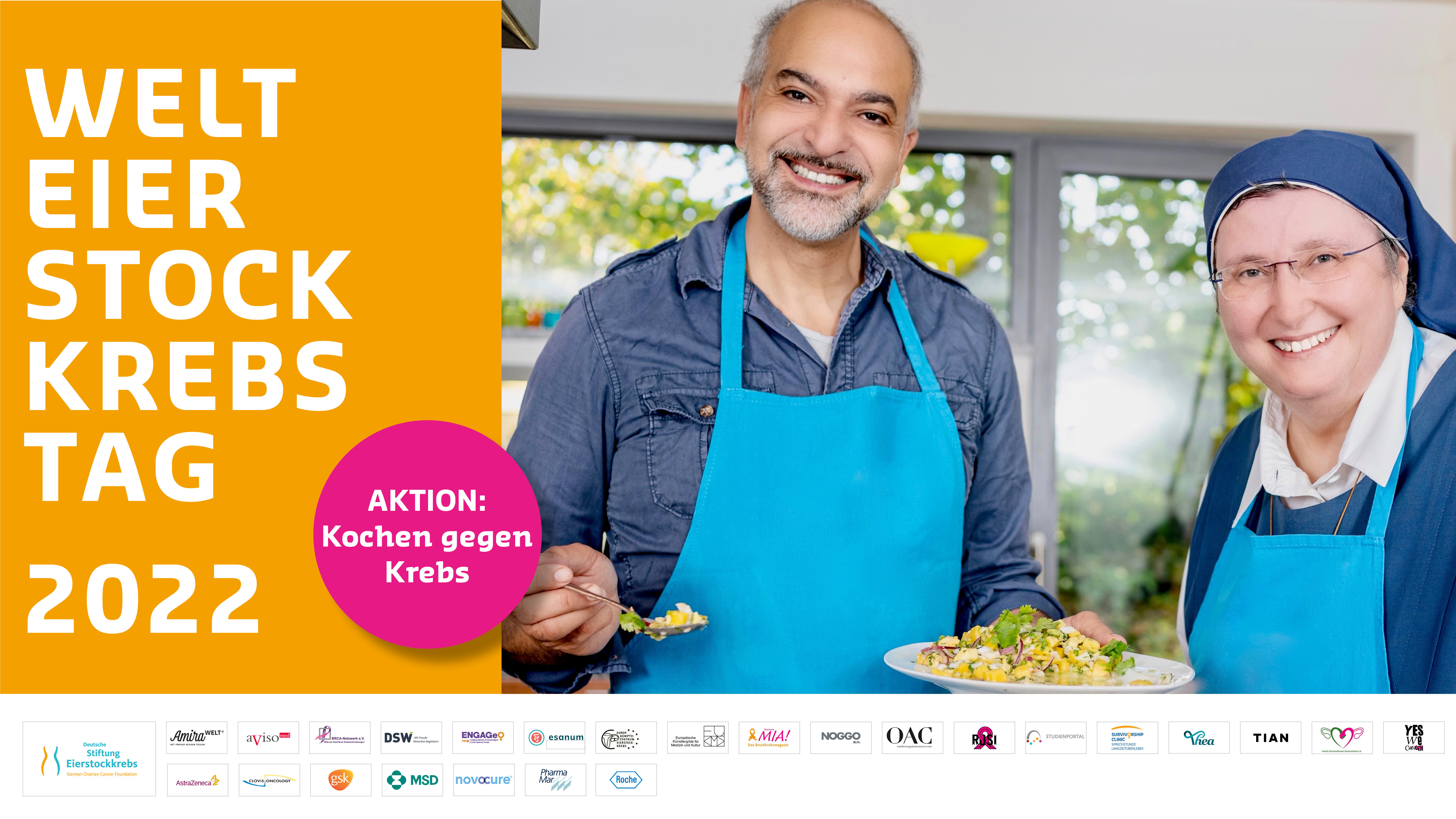 Jedes Jahr im Mai richtet die Deutsche Stiftung Eierstockkrebs den traditionellen Welteierstockkrebstag in Berlin aus. Der bunte Information- und Aktionstag lenkt die Aufmerksamkeit auf die seltene und immer noch tabuisierte Erkrankung Eierstockkrebs. Jährlich erkranken rund 7400 Frauen an Eierstockkrebs. Ovarialkarzinom zählt zu den am schwierigsten zu behandelnden Krebsarten weltweit. Studien belegen, dass die Qualität der Behandlung die Prognose stark beeinflusst. Der Welteierstockkrebstag verschafft Betroffenen und der Forschung Gehör. Hochaktuelle Fachvorträge zu neuesten Therapieansätzen werden vorgestellt und kombiniert mit supportiven Themen sowie kreativen Beiträgen. Dieses Jahr steht der Welteierstockkrebstag unter dem Stern „Ernährung und Kochen bei Krebs“.